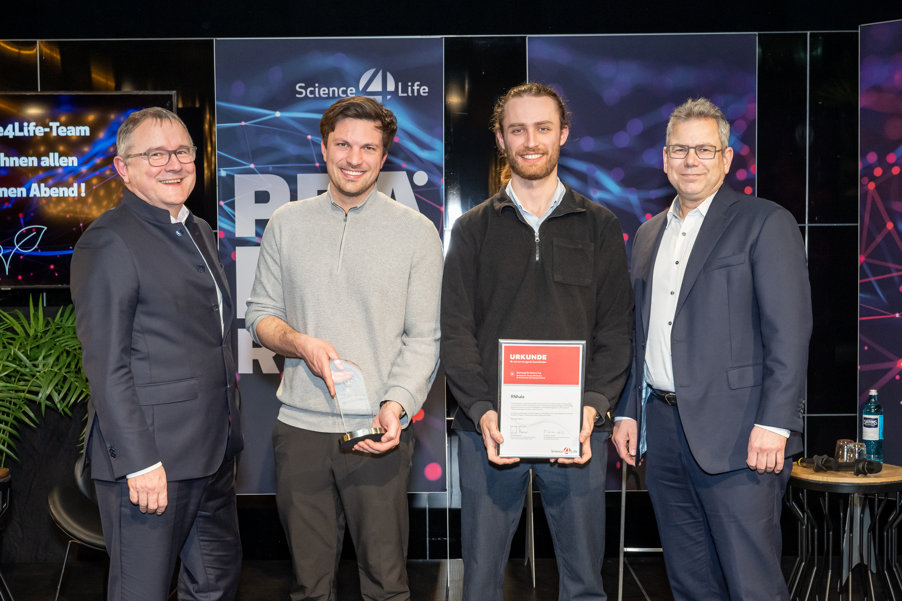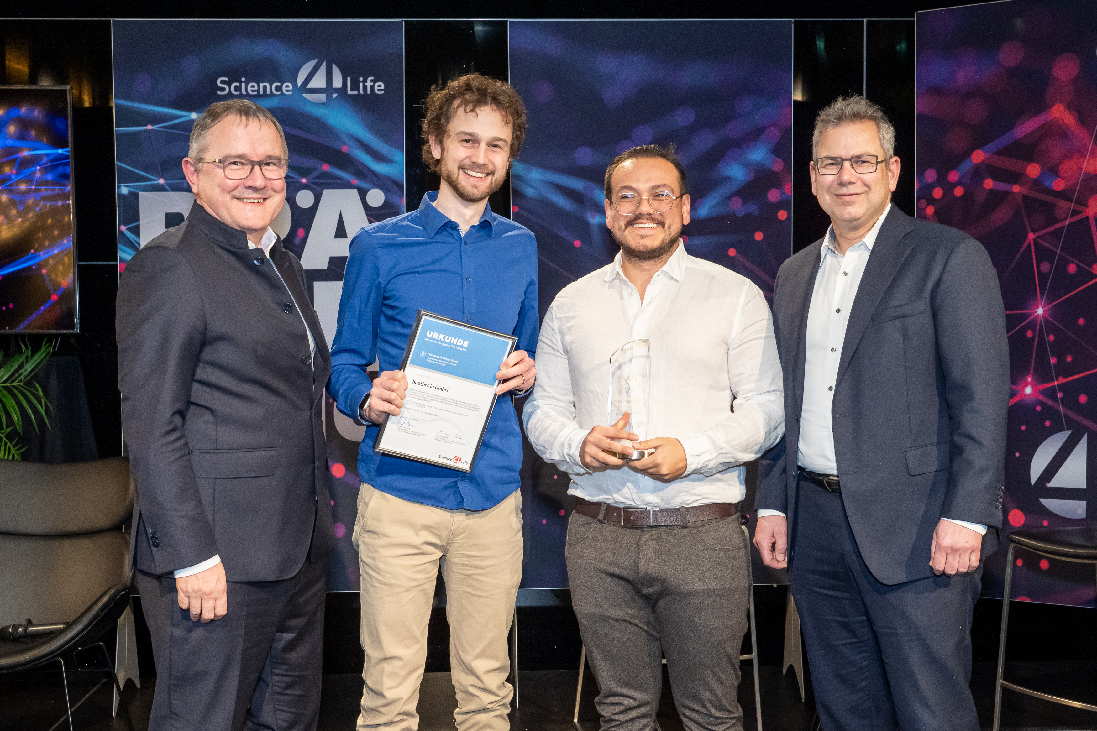„Die besondere Vielfalt der Projekte unserer Gewinnerteams zeigt, wie breit das Innovationsspektrum hierzulande aufgestellt ist. Von datengetriebenen Ansätzen bis zu neuartigen Materialien entstehen hier Lösungen, die wirtschaftliches Potenzial und gesellschaftlichen Nutzen verbinden. Solche Gründungsteams stärken nicht nur einzelne Branchen, sondern die Zukunftsfähigkeit unseres gesamten Innovationsökosystems“, sagt Dr. Rainer Waldschmidt, Geschäftsführender Vorstand des Science4Life e.V. und Geschäftsführer der HA Hessen Agentur GmbH und der Hessen Trade & Invest GmbH. Sein Co-Vorstand bei Science4Life e.V., Dr. Stefan Bartoschek, R&D Workforce Engagement Business Partner bei Sanofi Deutschland, fügt hinzu: „Was mich besonders beeindruckt hat: Es geht den Teams hier nicht um Visionen auf dem Papier, sondern um konkrete Lösungen mit klarer Anwendungsperspektive. Genau diese Umsetzungsorientierung ermöglicht es dem Gesundheitswesen, schneller vom Forschungsergebnis zur Verbesserung für Patientinnen und Patienten zu kommen”.